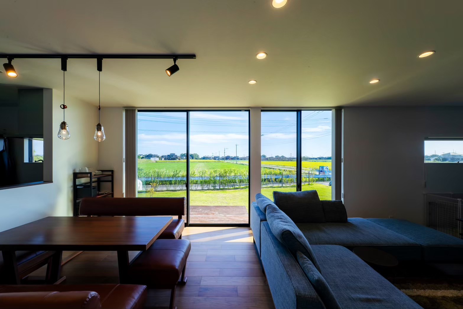 リビングからウッドデッキ、庭の芝生の先に広がる田園