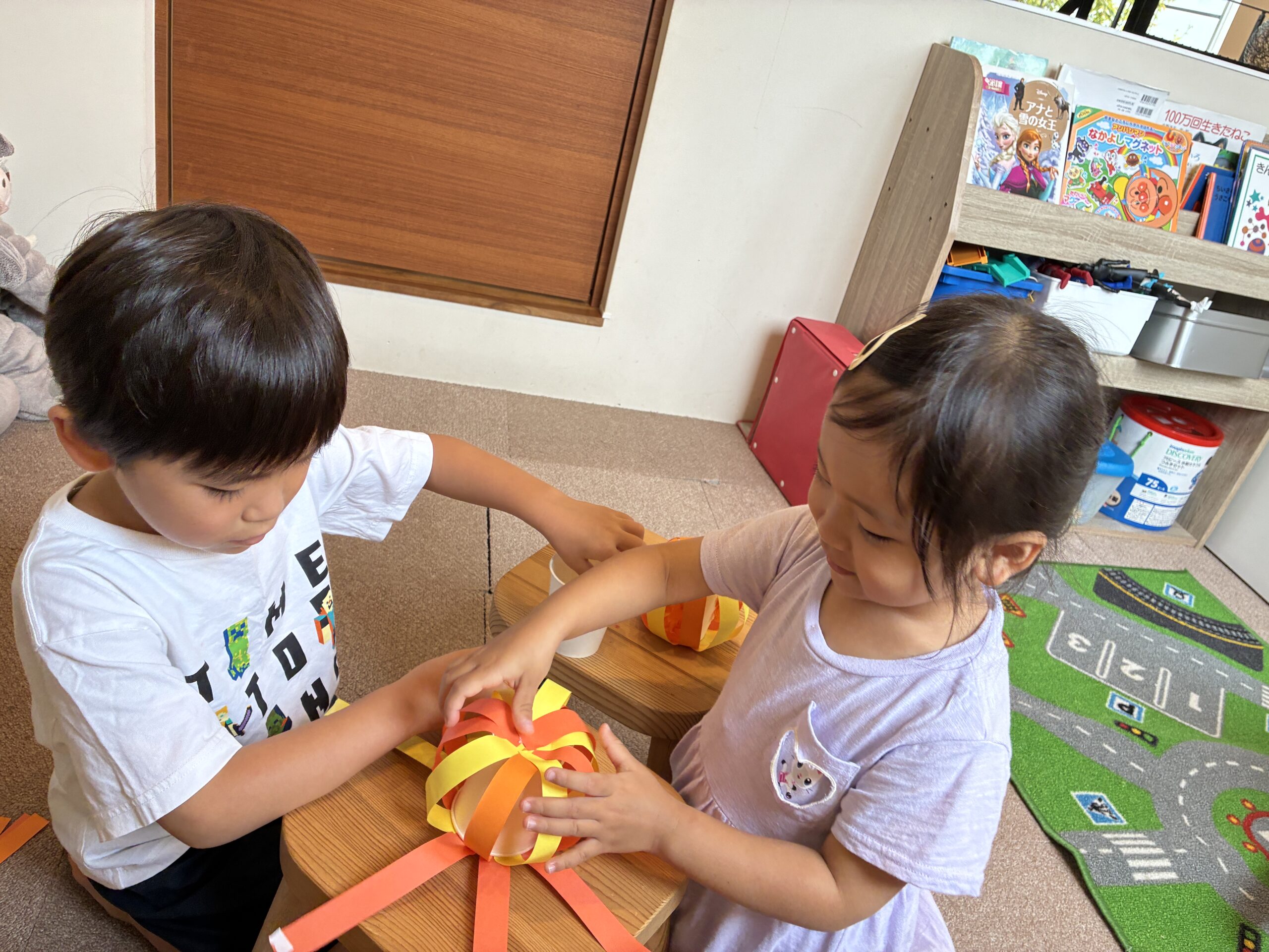 3色ある画用紙の色の配置を考えたり、「どっちが早く貼り終わるか競争しよう!」と楽しそうな声が聞こえたり、終始笑顔でカボチャを作っていました。