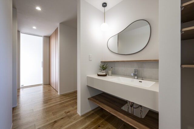 一方、分けた方の「洗面台」は、あえて廊下やホールのオープンな場所に配置する設計が増えています。