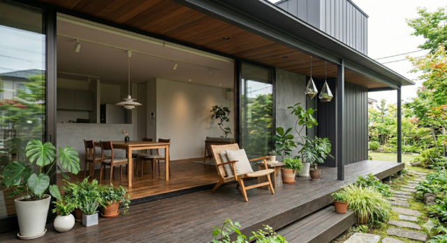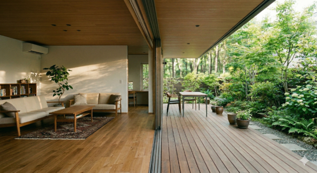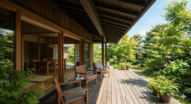 日本の伝統的な住まいにあった「縁側」や「深い軒下」、現代で言えば「ウッドデッキ」「インナーテラス」「バルコニー」などがこれにあたります。