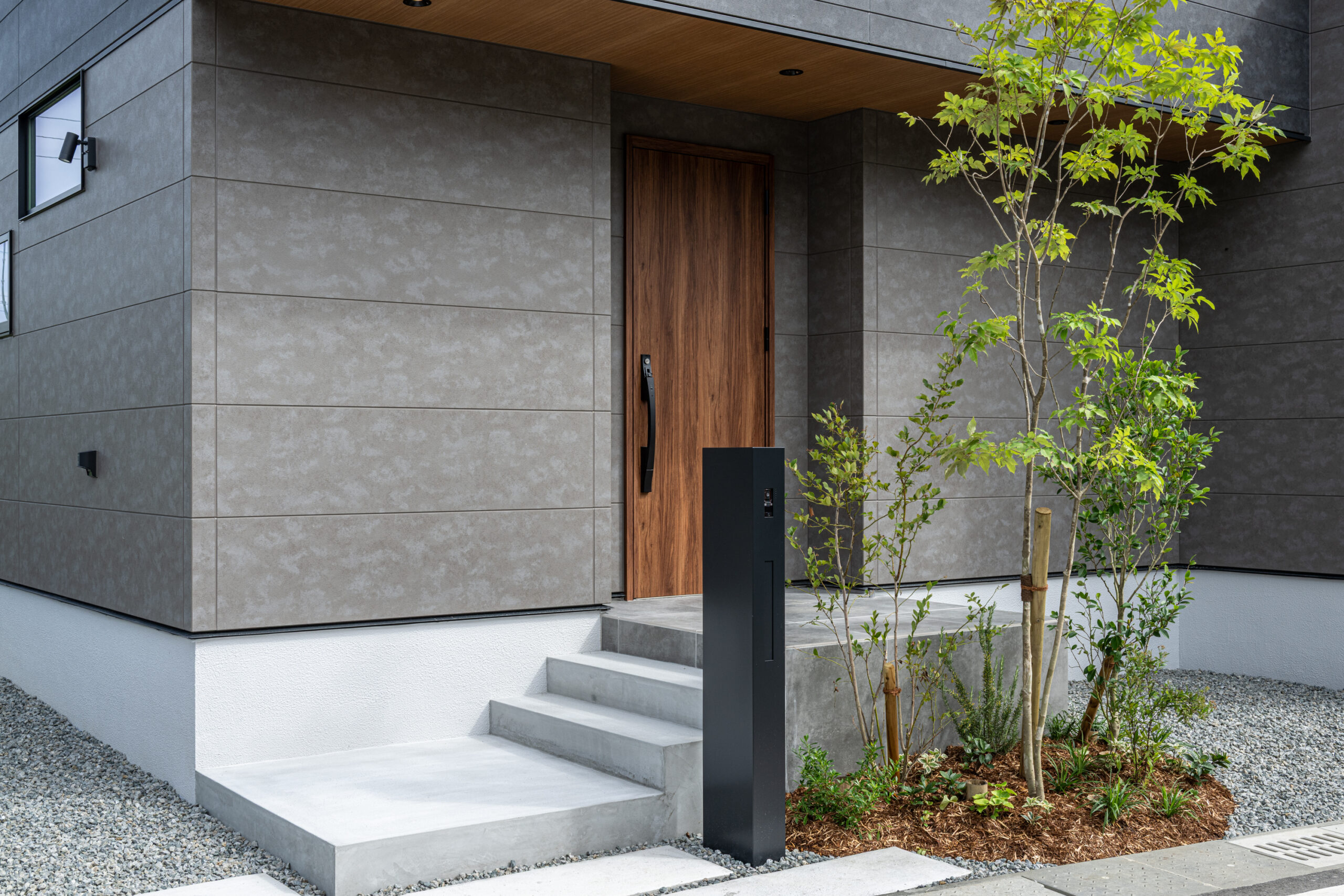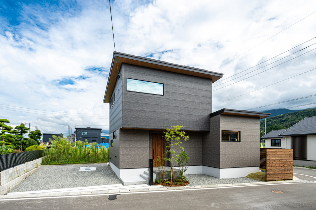 2025年9月末完成の新しいモデルハウス!ダークグレーを基調とした落ち着きのある外観。 -
