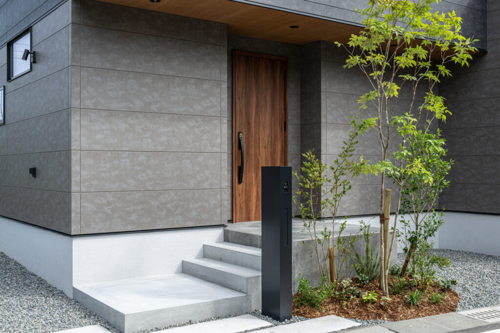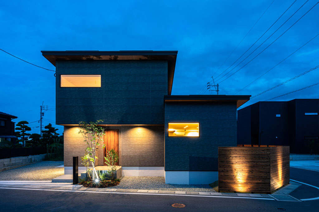 ダークグレーを基調とした落ち着きのある佇まいの外観。内装は外観と調和するスタイリッシュな空間デザイン。