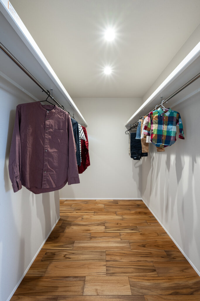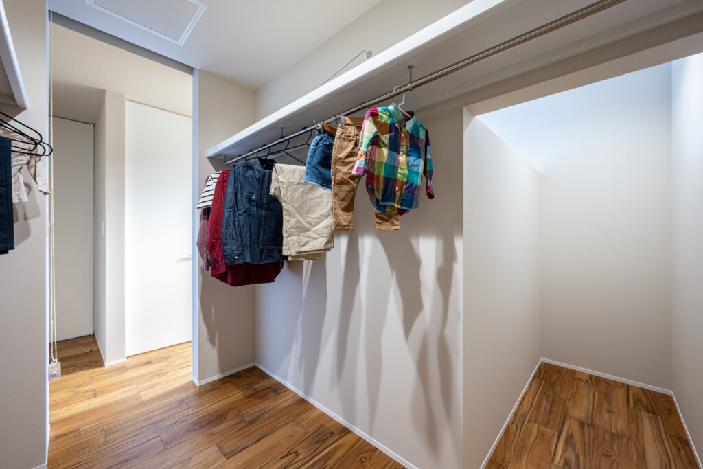 2階にもWICを配置。約3帖のスペースで家族全員分の荷物や衣類もスッキリ収納。 -
