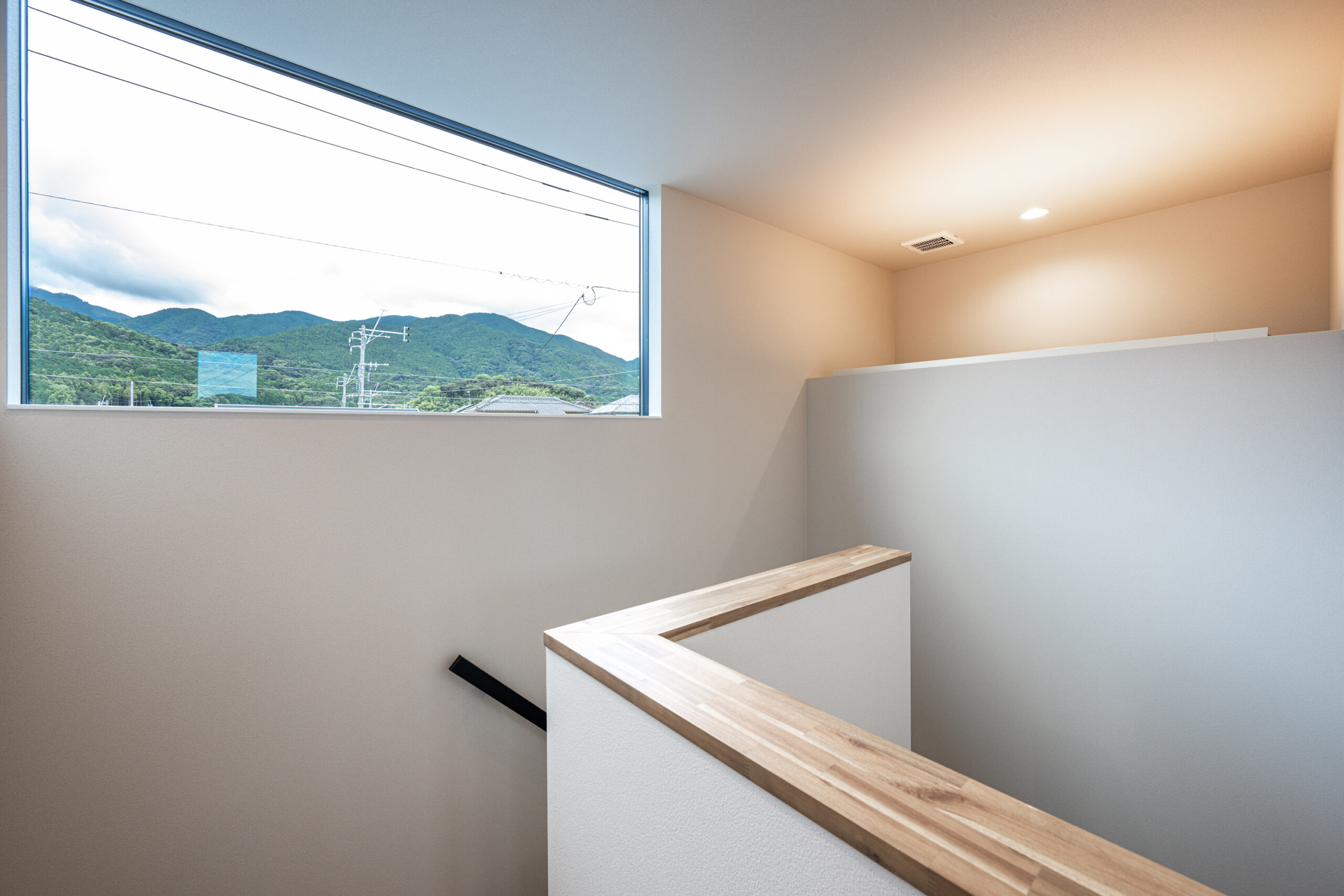 2階ホールの窓からは美しい山並みの景色を楽しめる。 -