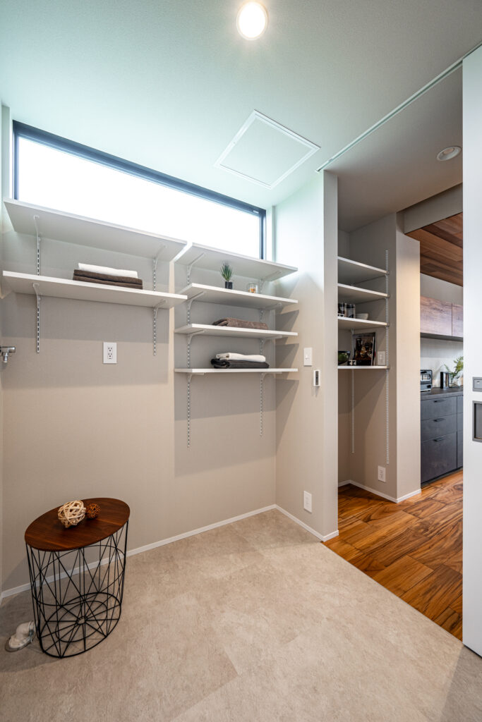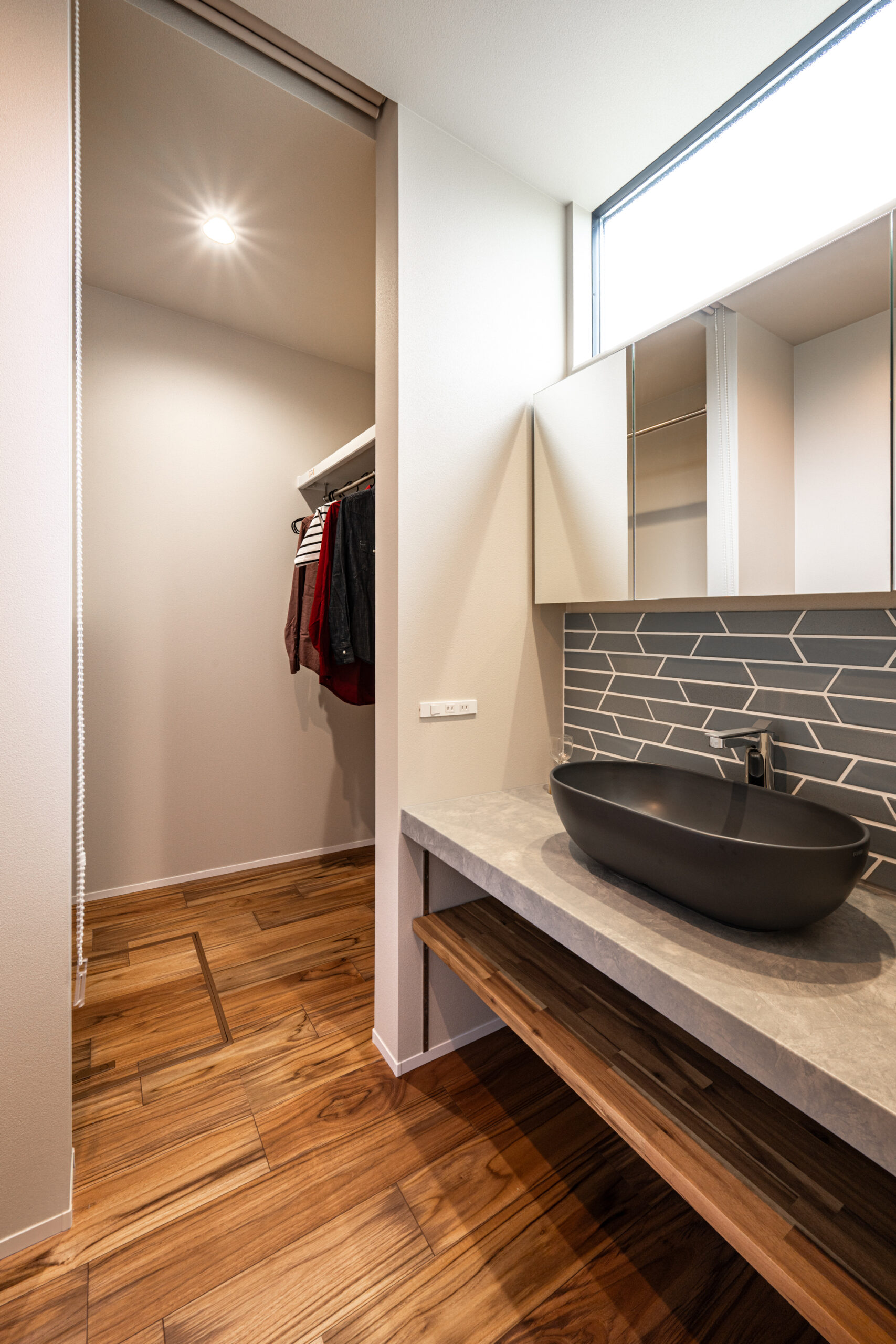 洗面の横には約1.5帖のWICを配置。コート等を脱いだ後に手を洗える帰宅動線。 -