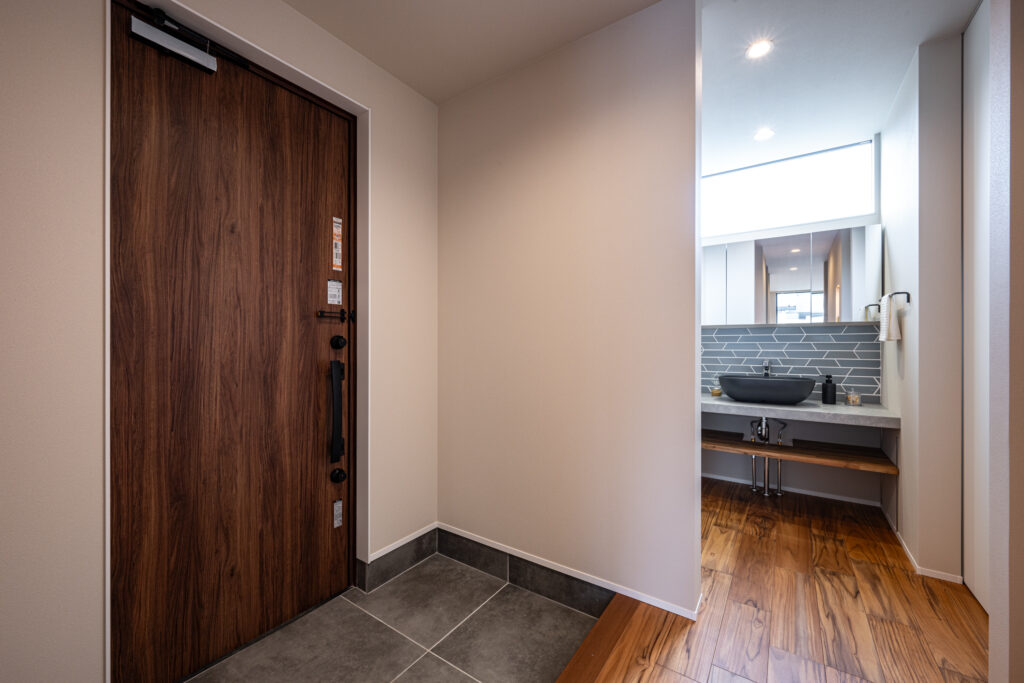 玄関のすぐそばに洗面を配置。帰宅後すぐに手が洗える。 -