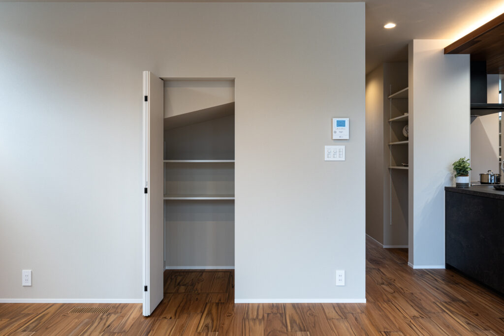 リビングからの階段下に物入も配置。おもちゃなどの片付けに便利。 -