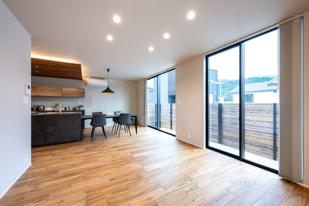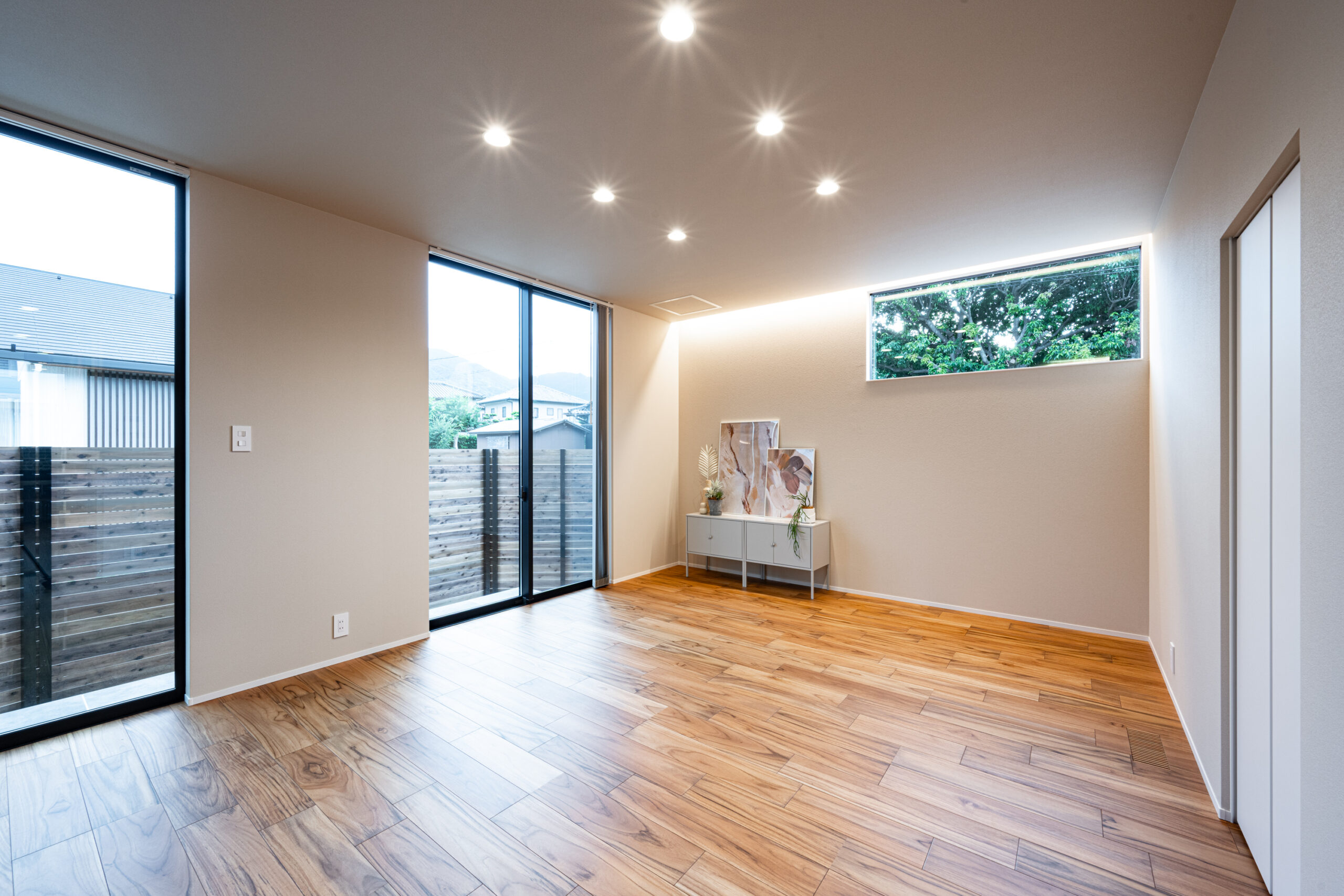 約19帖のリビング。南側の大きな窓でより開放的に。 -