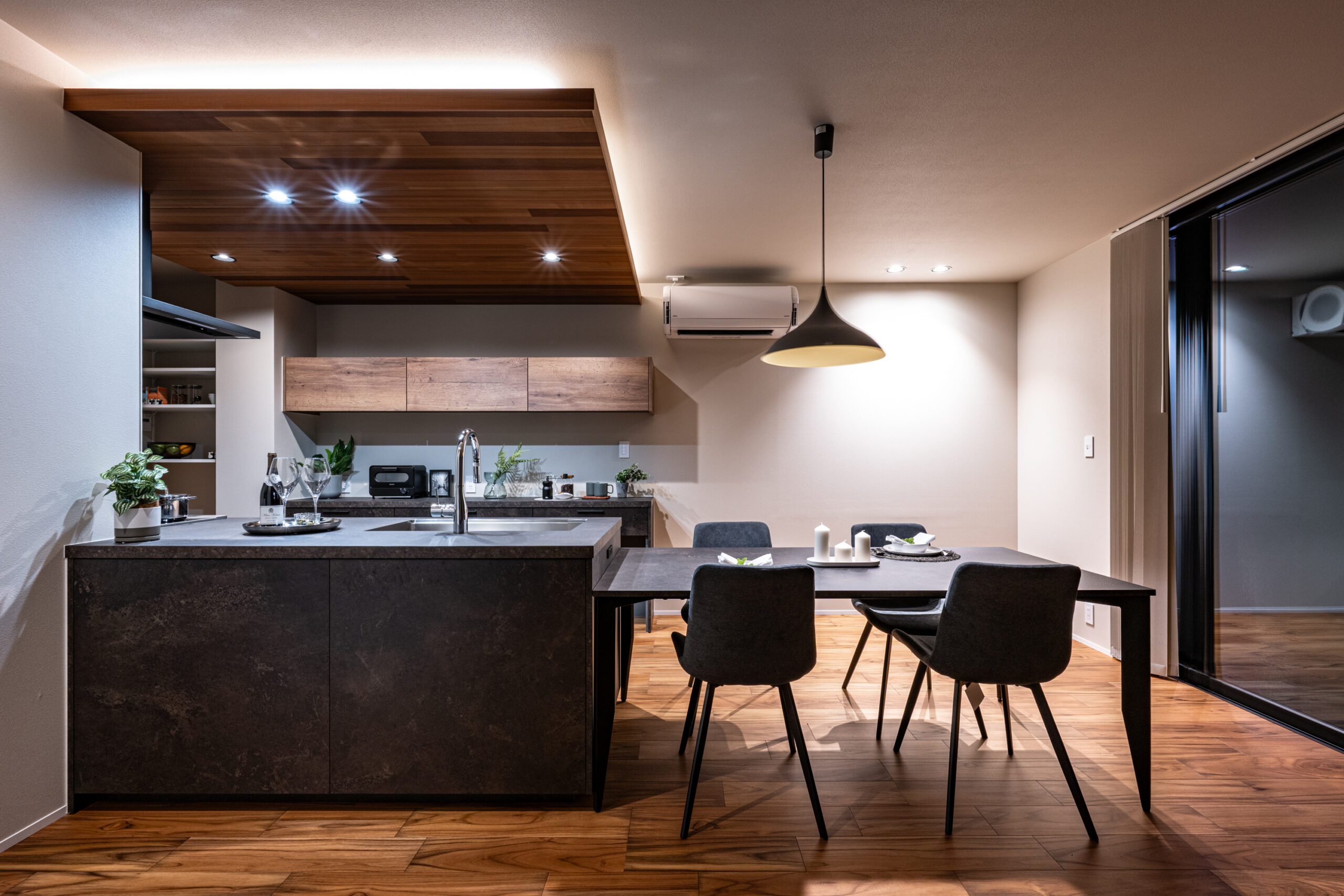 折り下げ天井と間接照明が美しいダイニング空間。 -