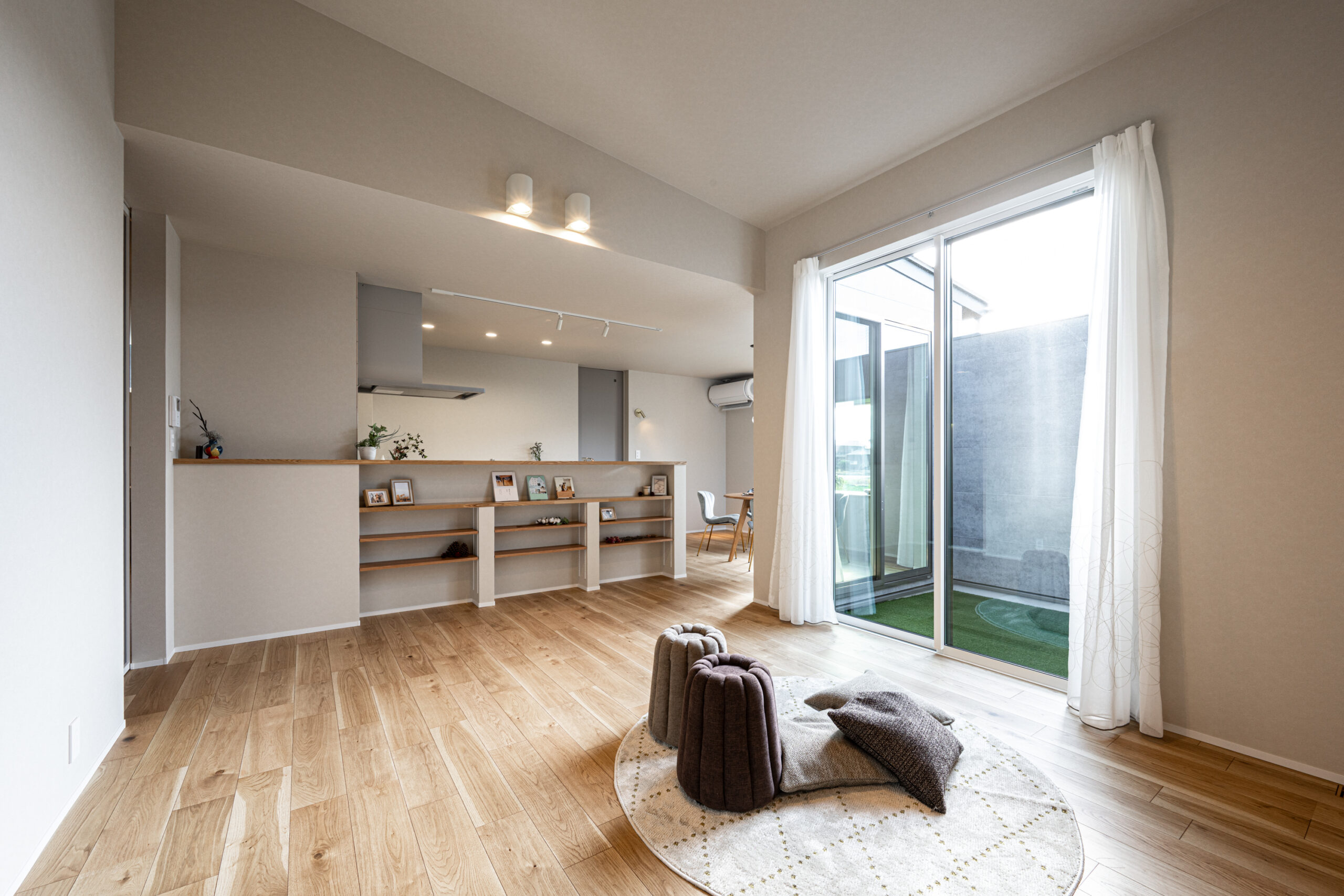 LDKは約21帖の広々空間。勾配天井やリビングとつづく中庭でさらに開放的に。