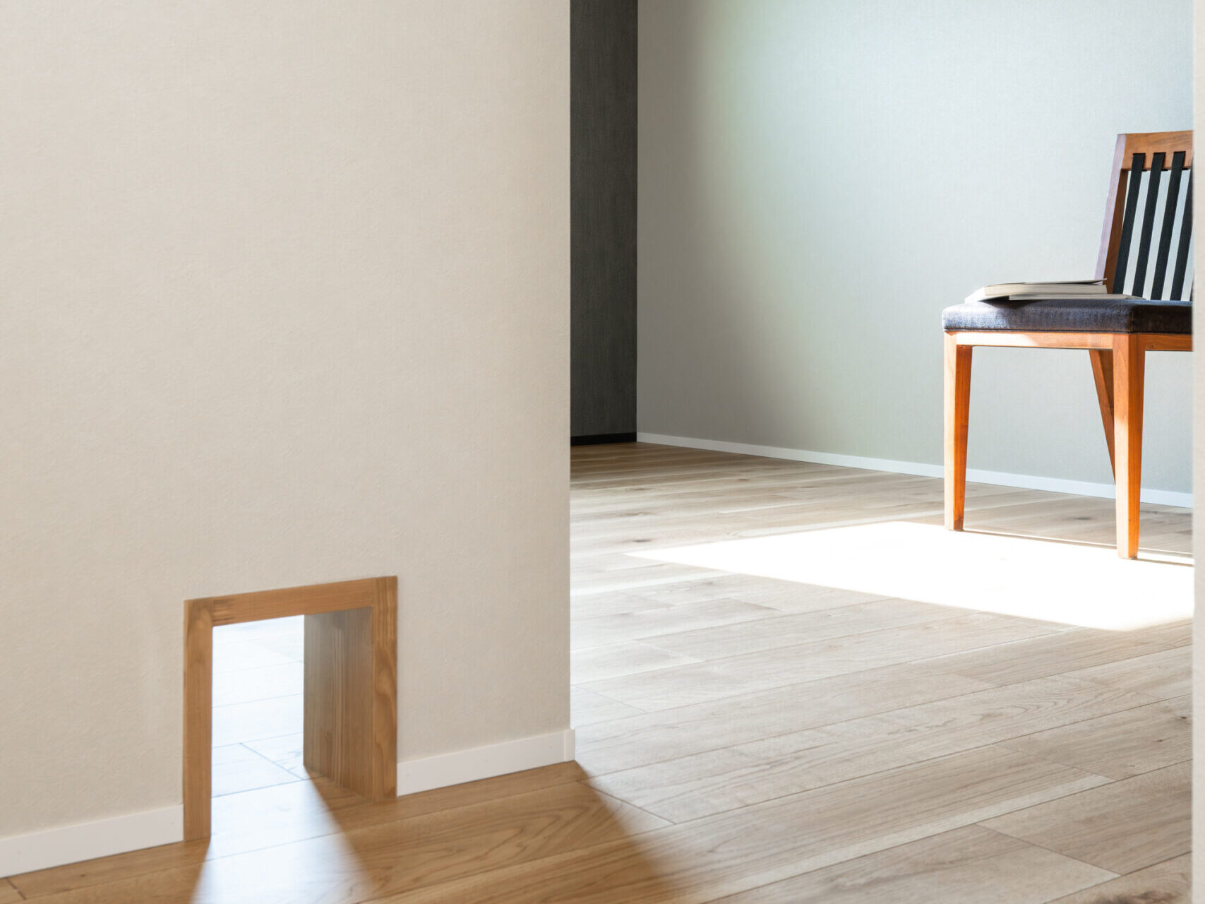 猫トンネルを設けて、愛猫がリビング⇔主寝室を行き来できる設計。 -