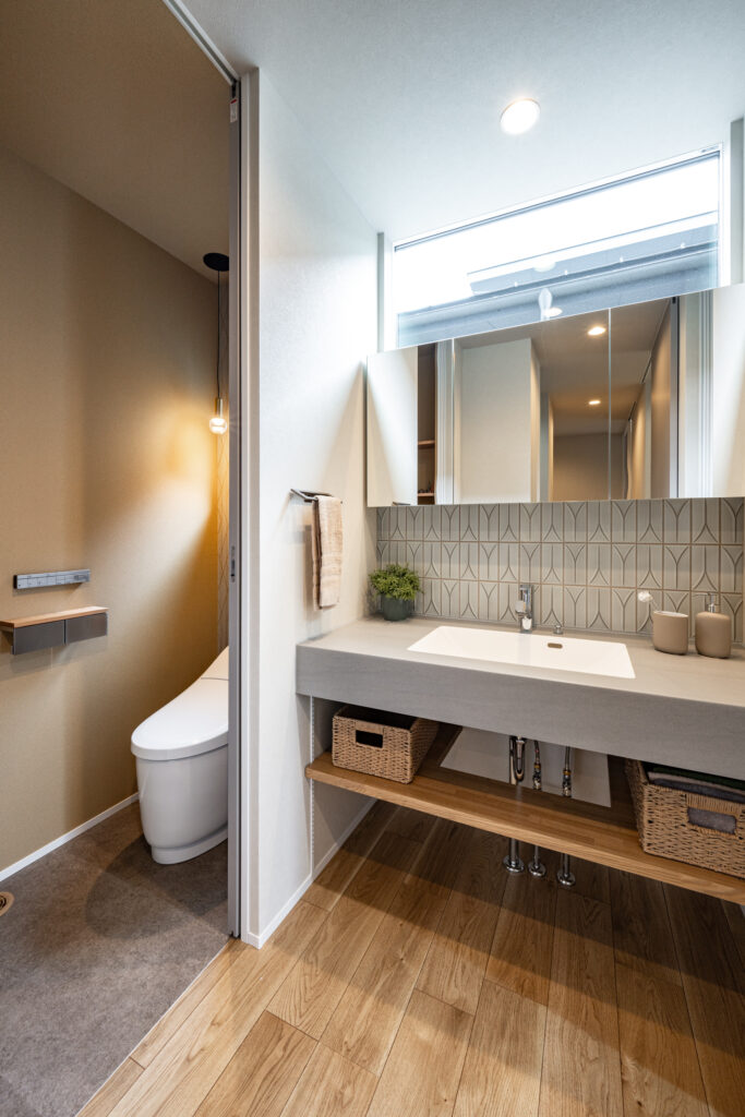 造作洗面台はトイレの隣に配置し、衛生面を配慮。 -