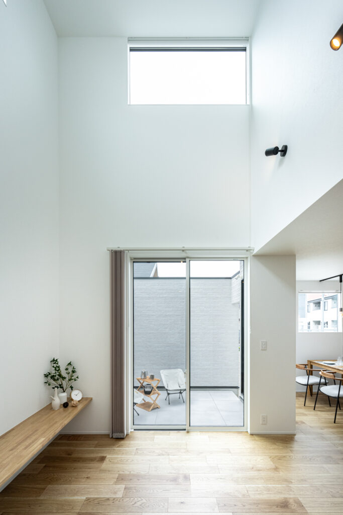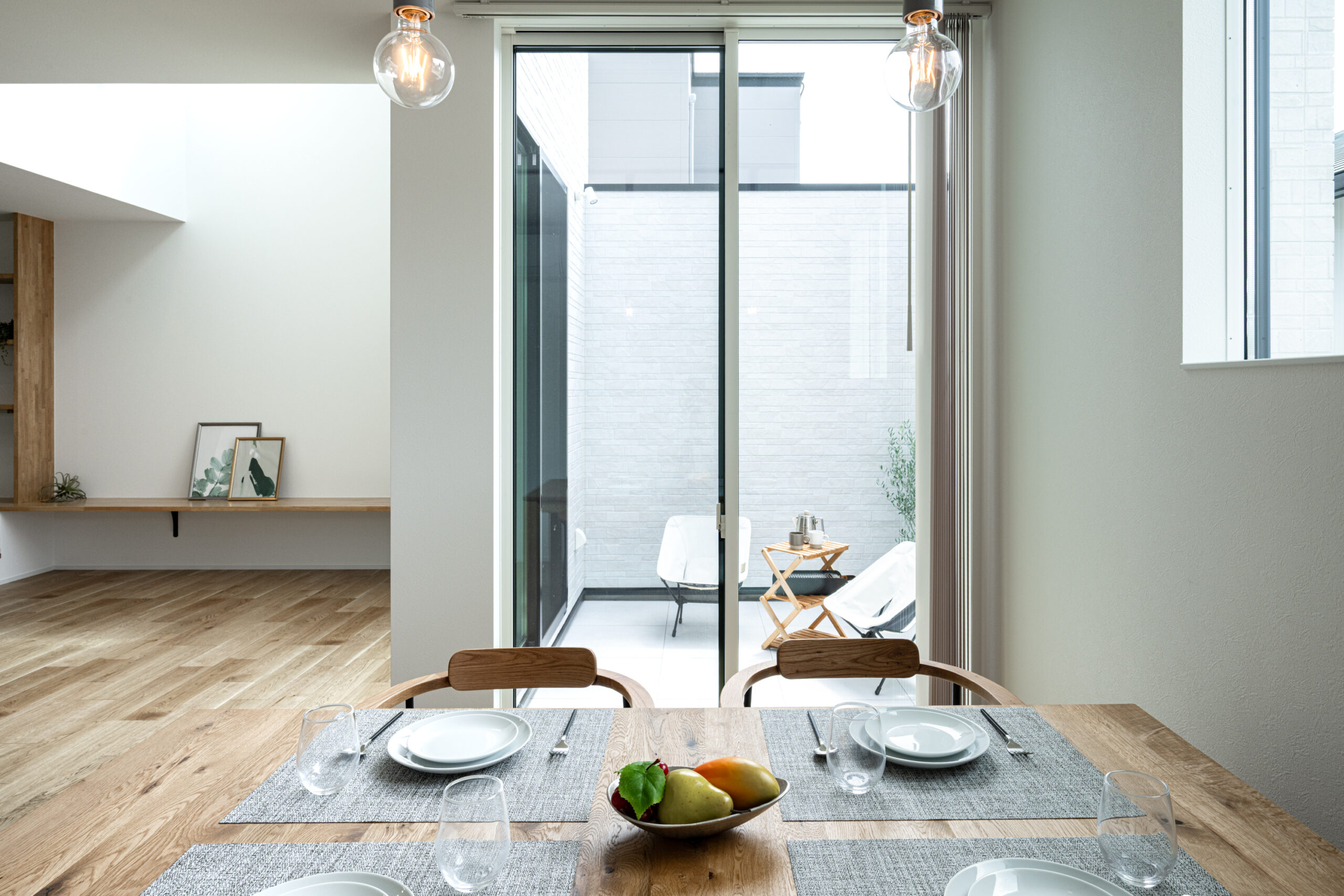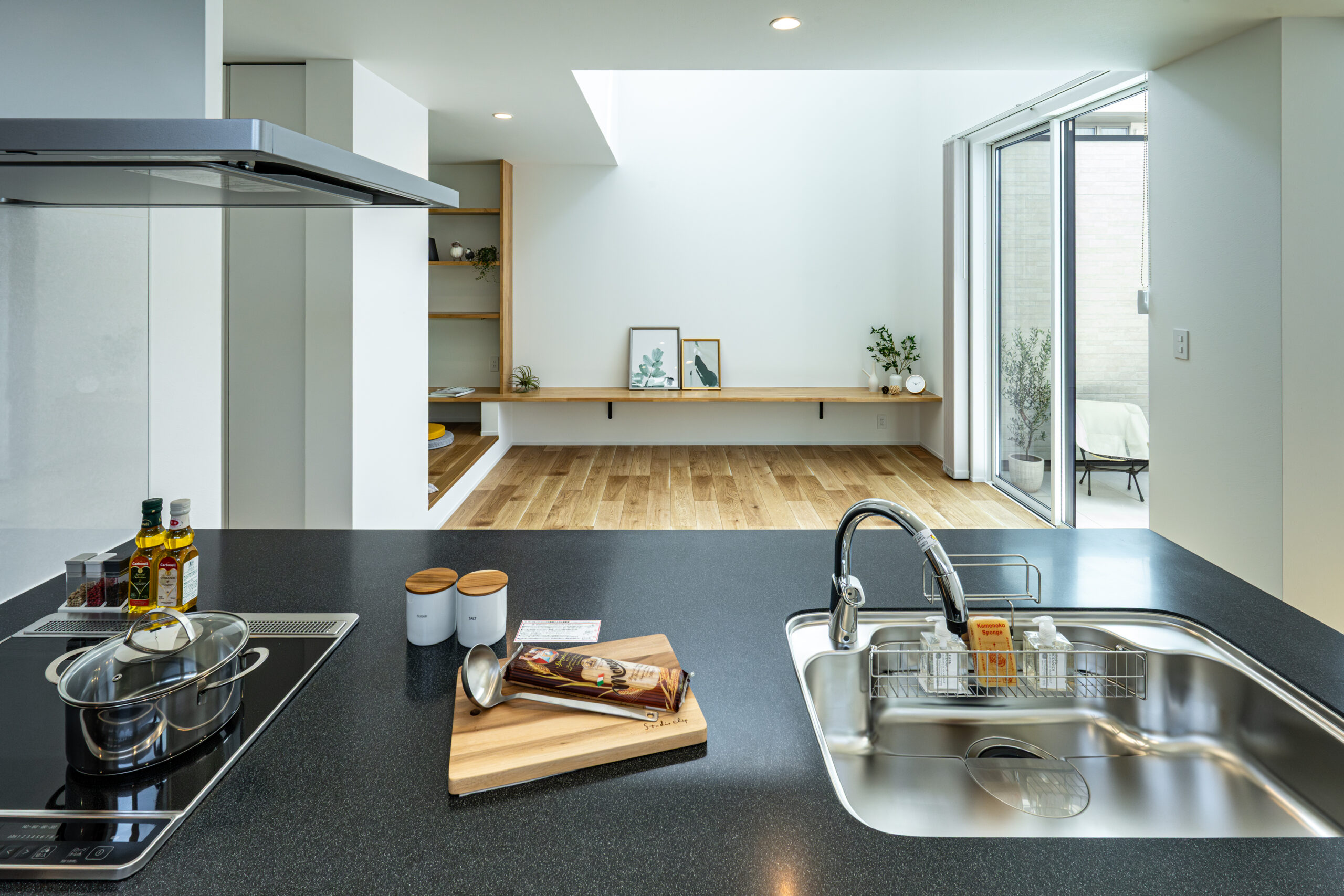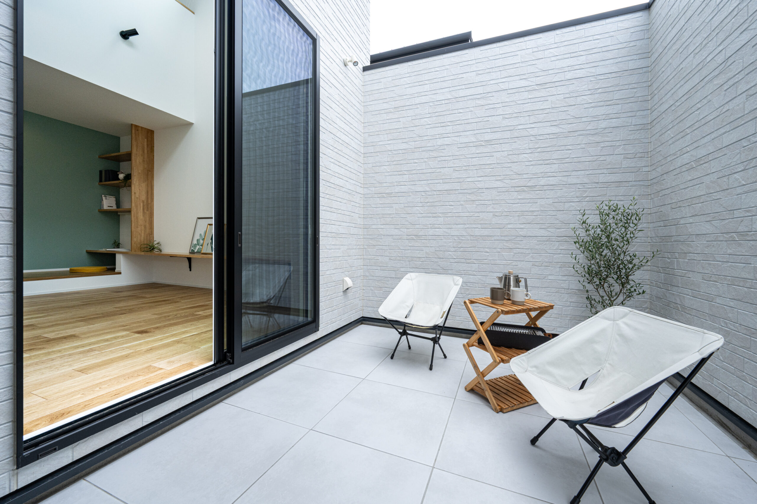 シンプルなホワイトの外壁にアクセントの窓が映える外観。内観は、1Fと2Fのつながりを感じられる2つの吹き抜けで光が通るデザインに。さらに、遊び心あふれるヌックやカウンター、中庭が暮らしに彩りを添えてくれます。中庭はプライバシーが守られるように設計をしているため、周りからの視線を気にせずに過ごすことができます。