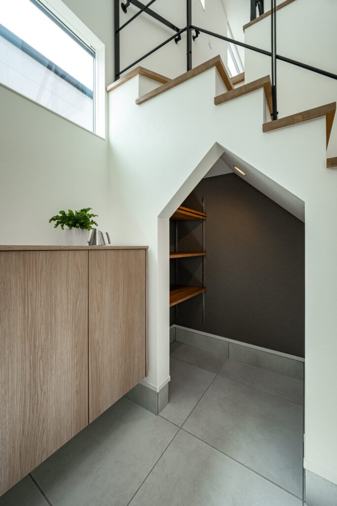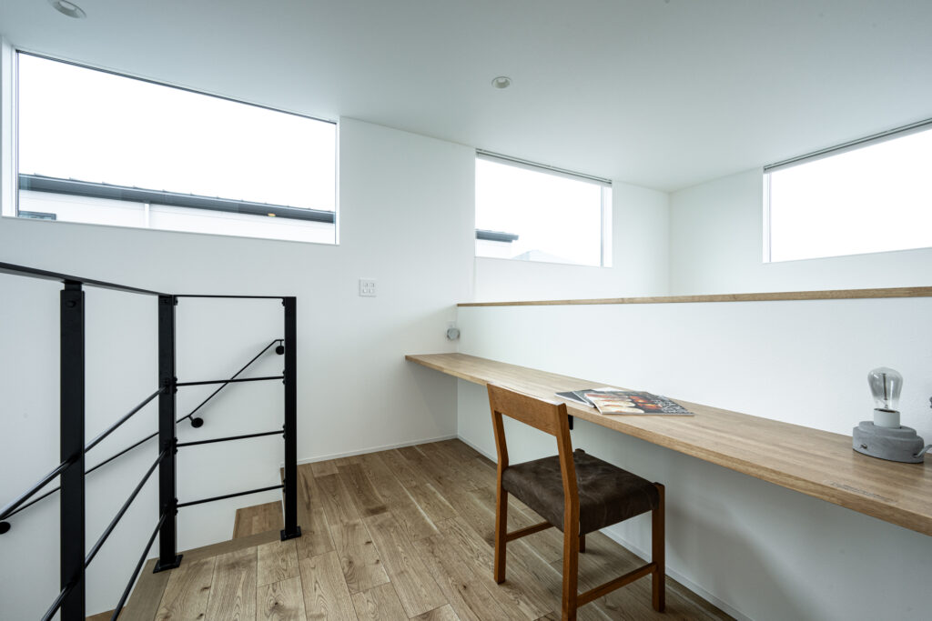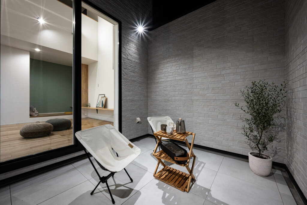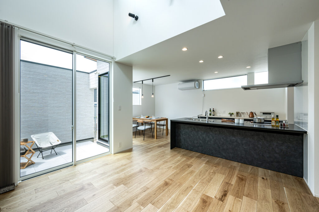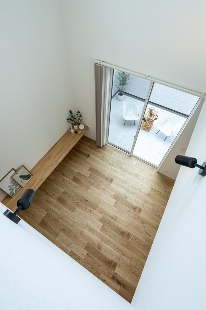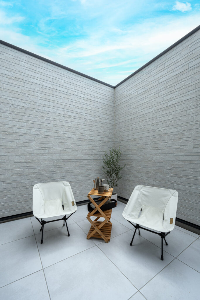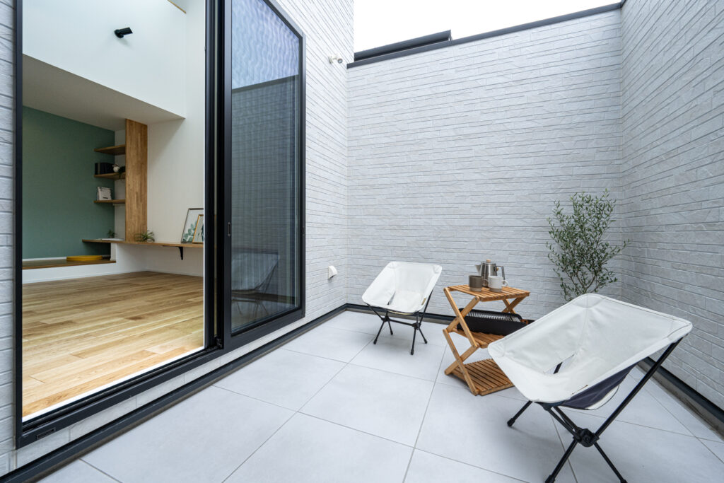 シンプルなホワイトの外壁にアクセントの窓が映える外観。内観は、1Fと2Fのつながりを感じられる2つの吹き抜けで光が通るデザインに。さらに、遊び心あふれるヌックやカウンター、中庭が暮らしに彩りを添えてくれます。中庭はプライバシーが守られるように設計をしているため、周りからの視線を気にせずに過ごすことができます。