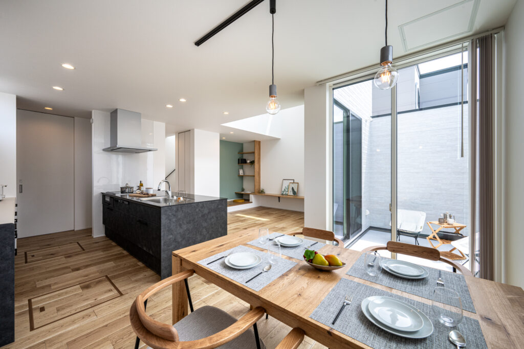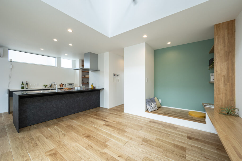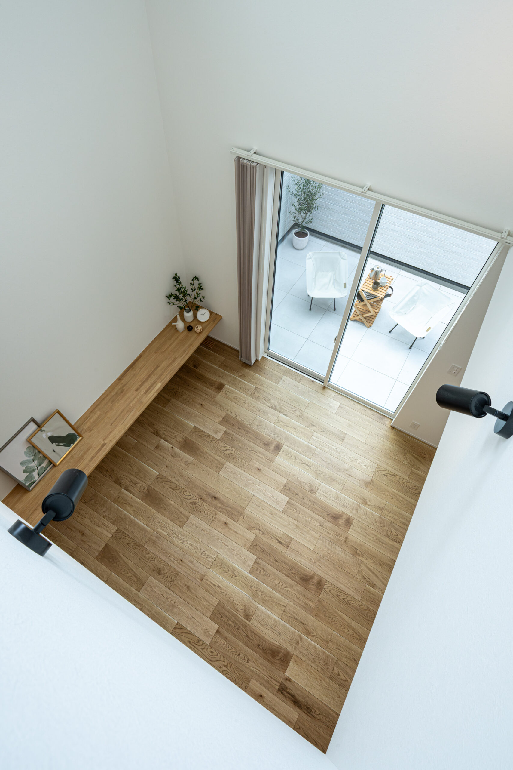 1階と2階のつながりが感じられる2つの吹き抜けを採用し、光が通る空間デザインに。さらに、ヌックや中庭などの遊び心ある空間をつくることで暮らしに彩りをプラス。注文住宅会社ならではの工夫が、髄所に感じられるモデルハウスです。