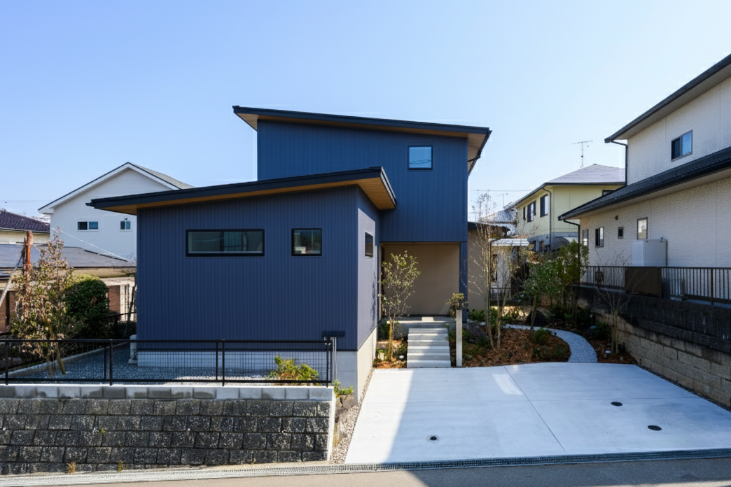 ガルバとアースカラーの吹き付け塗装を組み合わせることでかっこよすぎず柔らかい印象の外観に。