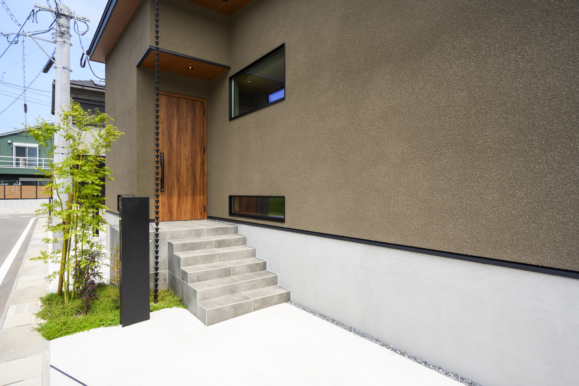 住まいの表情を豊かにする、美しい鎖樋と鮮やかな植栽。