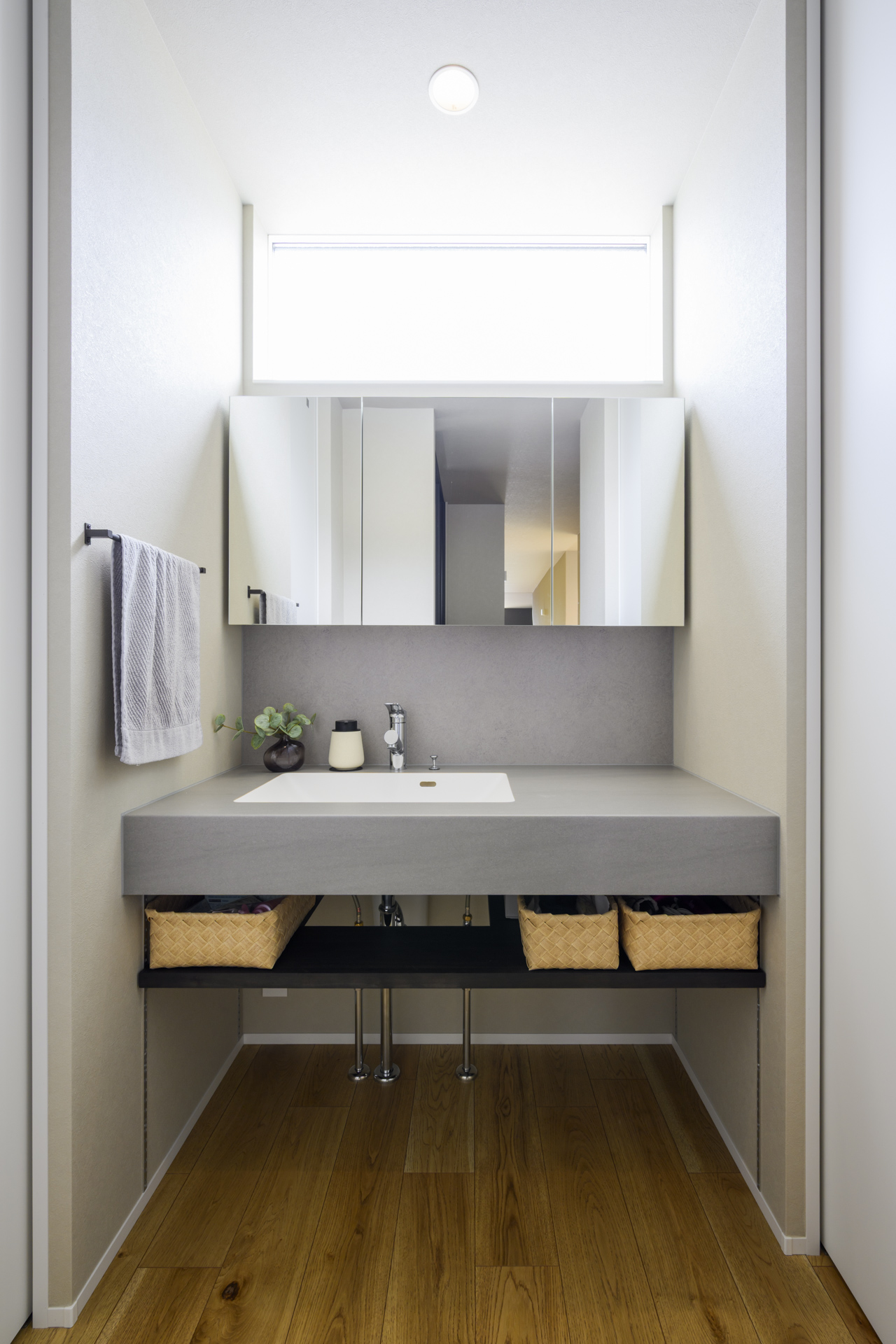 グレーのカウンターが美しい造作洗面台。トイレ横に配置することでスムーズな手洗い動線を実現。