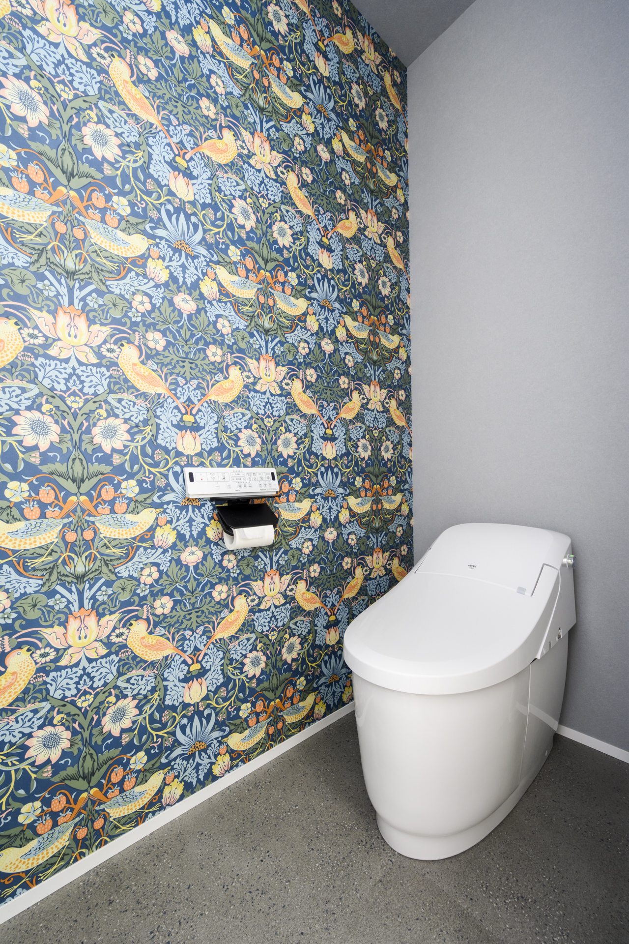 トイレのアクセントクロスには、ウィリアム・モリスの「いちご泥棒」を採用。小さな空間だからこそ取り入れた、印象的な遊び心。