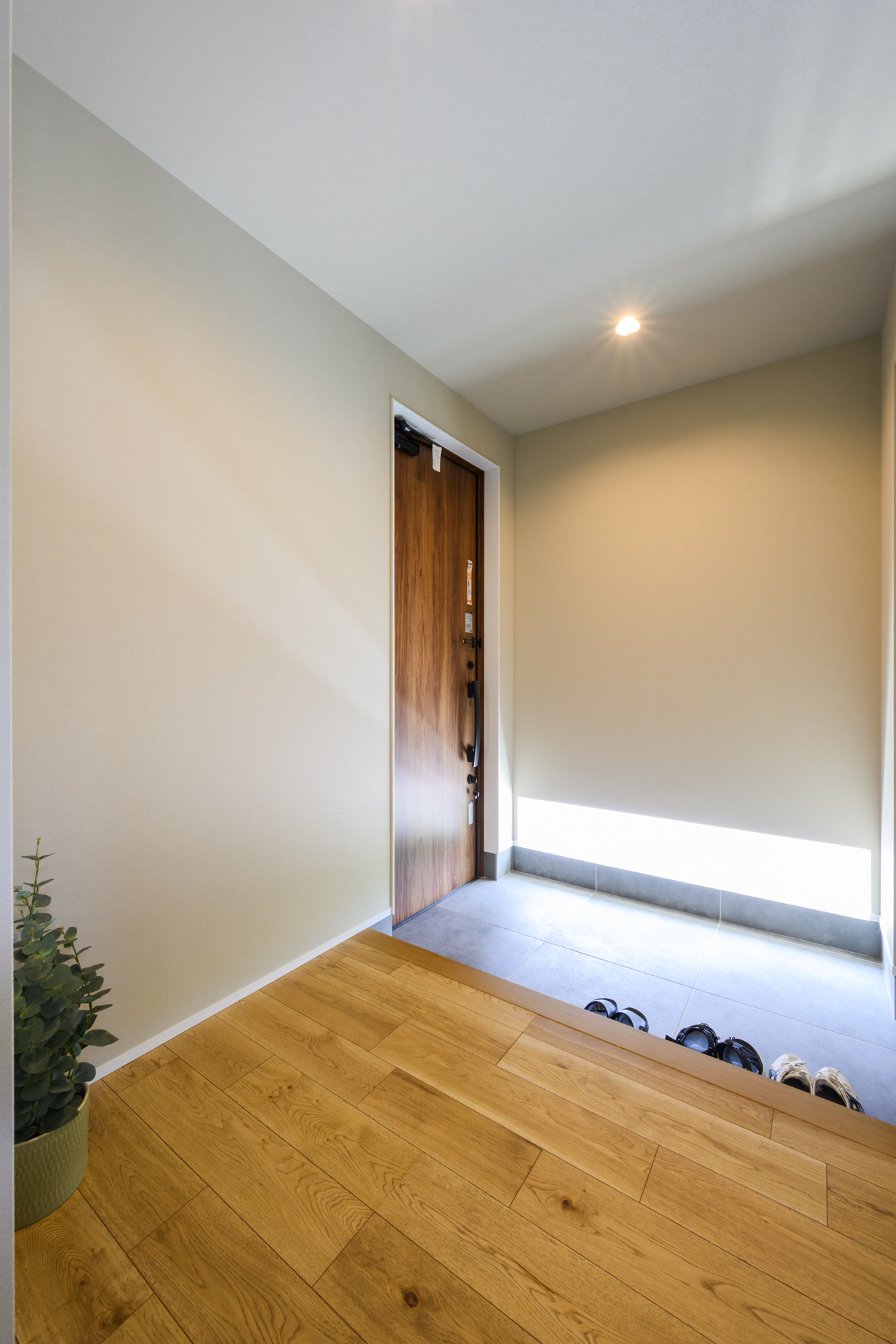 地窓から光を取り込む明るい玄関。約1.5帖のゆとりあるポーチで家族みんなのお出かけ準備もスムーズに。