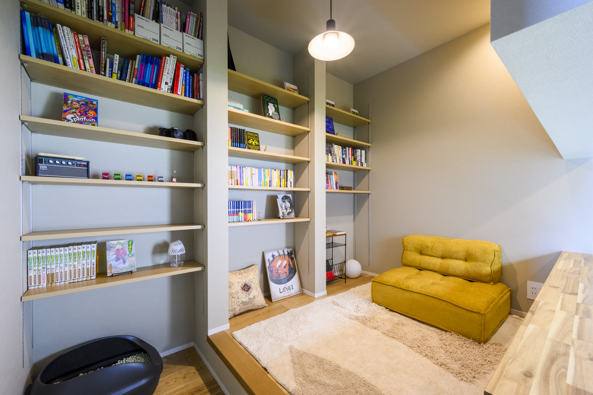 ほどよいおこもり感のある3帖の読書スペース。壁一面の本棚にお気に入りを並べた特別な空間。