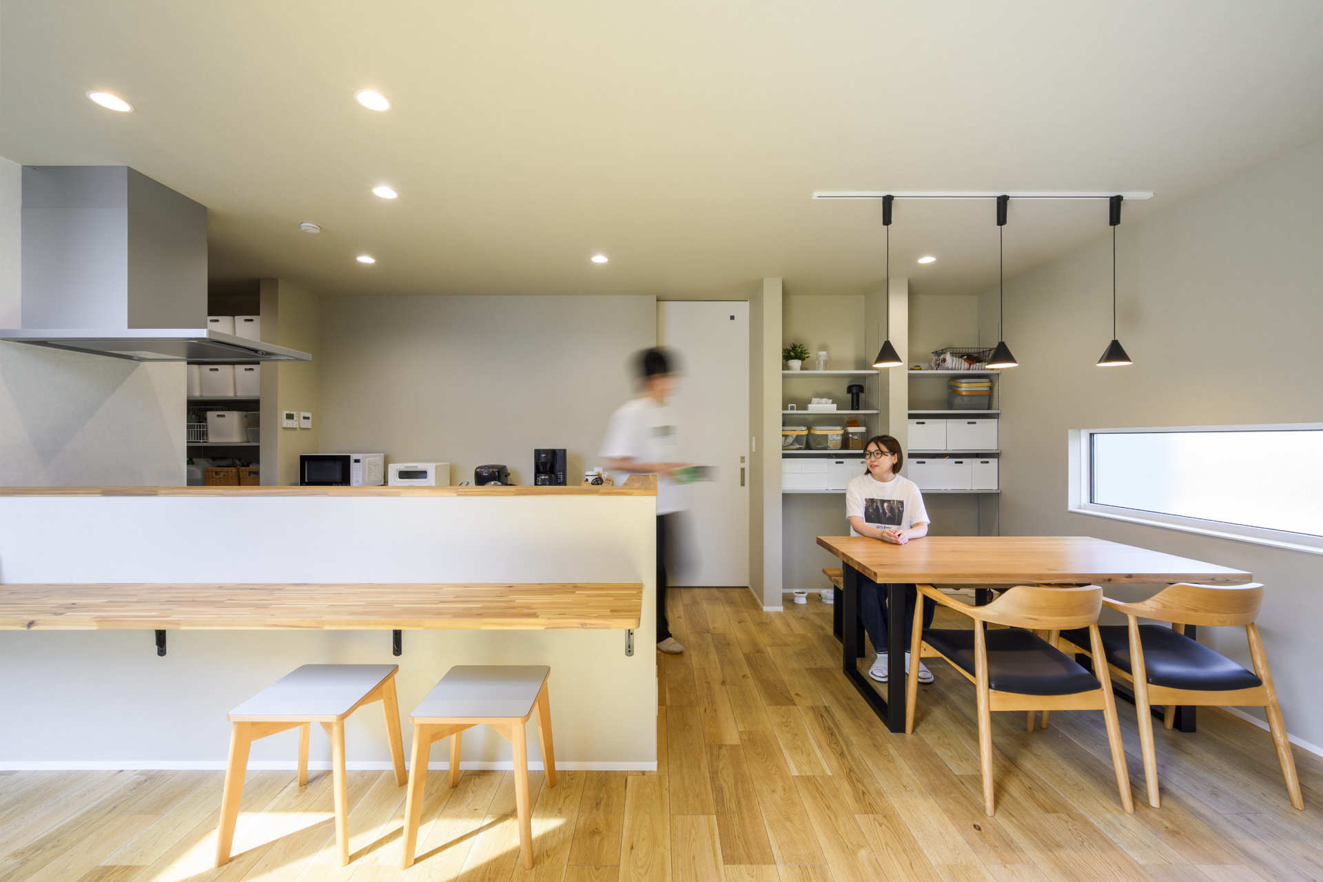 キッチンとダイニングを横並びにし配膳を楽にした、家族の会話が弾む動線。