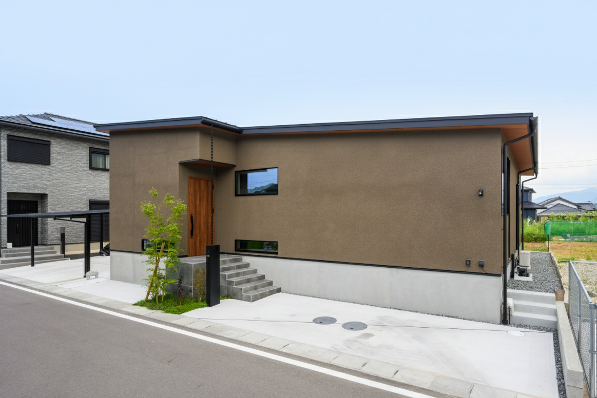 木調のドアが映える、落ち着いたアースカラーの外観。外壁にはデザイン性の高いジョリパッドを採用し温かみのある雰囲気に。